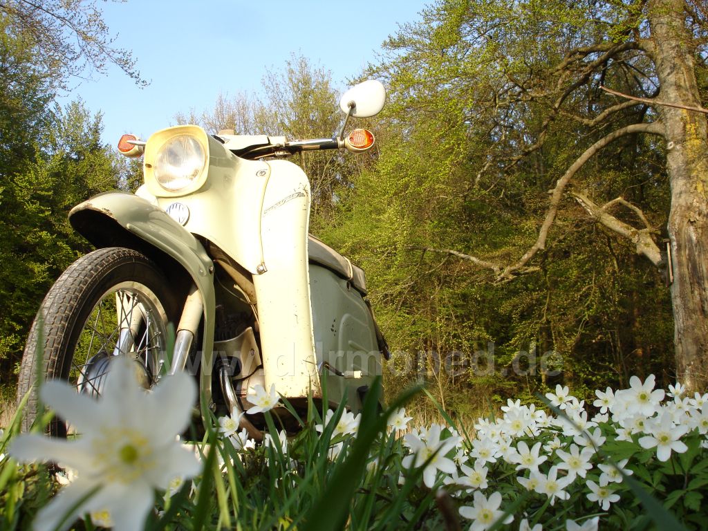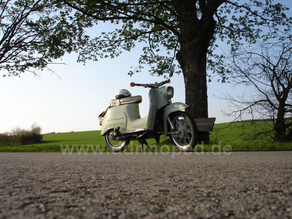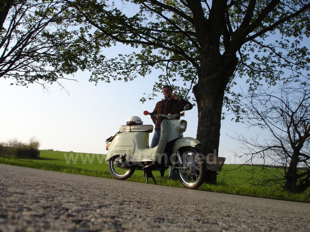 Und dann wollte ich doch mal mit Selbstauslöser den stolzen Besitzer mit auf´s Bild bannen, also die Kamera an den Straßenrand (also etwas auf die Gefällelastige Kante) gestellt und den 10s Auslöser gedrückt. Dann zum Moped auf die andere Seite gehechtet und gewartet. Nach ca. 2s merkte ich, dass ein Auto näherte... Links die Schwalbe, rechts die Knippse Auto durch ....2,5m...... Bangender Gesichtsausdruck und entsetzte Körperhaltung nix passiert *puh*