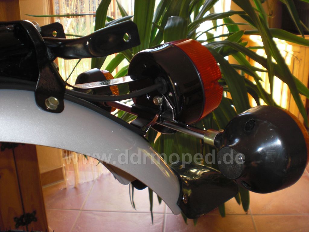 Ich mag dich  Die langen Federbeine haben etliche Nachteile, zum Beispiel steht das Moped da nicht mehr so schön. Ein kleiner Detailfehler fällt mir diesbezüglich noch auf: Die Feder dürfen nicht verchromt sein, sonder schwarz "pulverbeschichte?" naja, mit so einer Art Plaste überzogen. Und einen Seitenständer am Fußrastenträger gabt Anno 1982 auch noch nicht