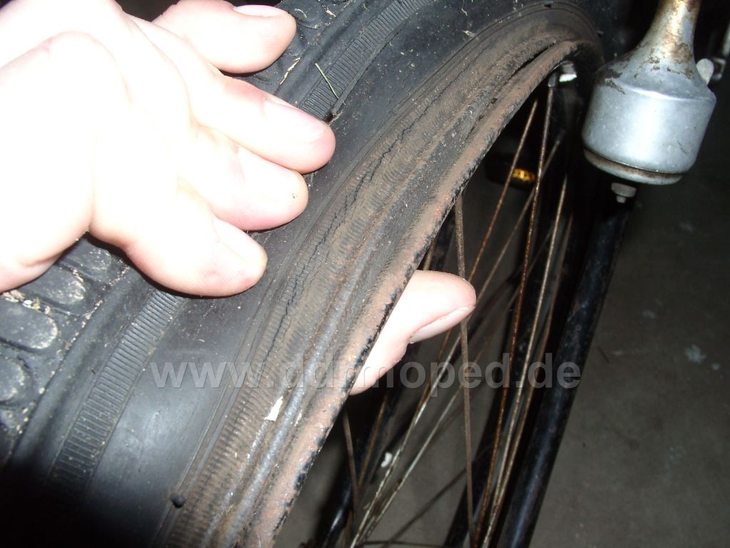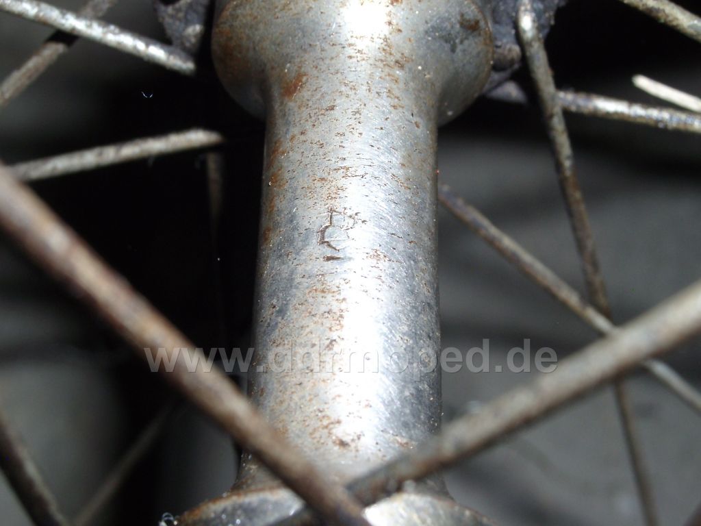 Die vordere Felge ist genau umgekehrt liniert, wie die hintere, aber etwa im gleichen Zustand. Das lässt darauf schließen, dass die Felgen zur gleichen Zeit gebaut wurden, also wharscheinlich noch original.