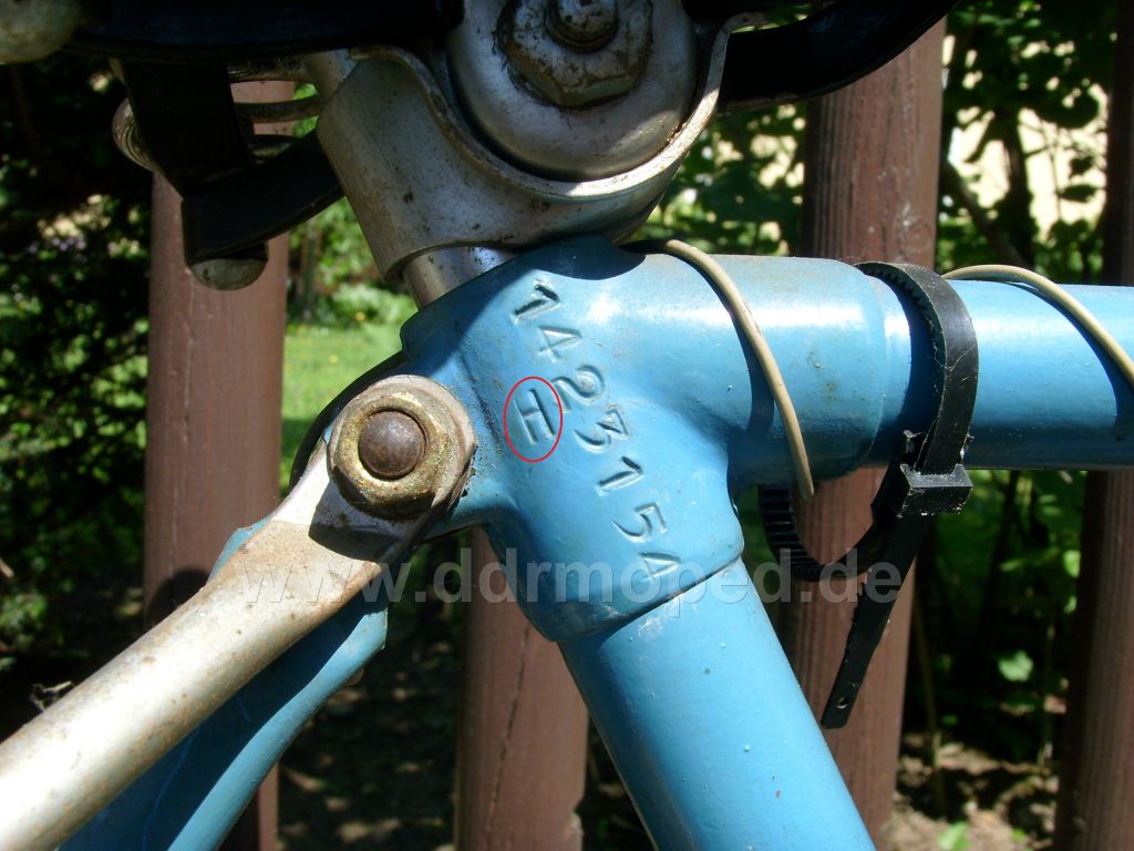 Das Gefährt weist vor allem folgende Herausstellungsmerkmale auf: geschlitzte Steuerkopfmuffen und Rahmennummer (Sattelmuffe rechts 1.423.154) mit Buchstabe „H“. Weitere Merkmale sind: Fixierrädchen rechts, Lochabstand Steuerkopfschild =75mm, Rahmenhöhe: 550mm