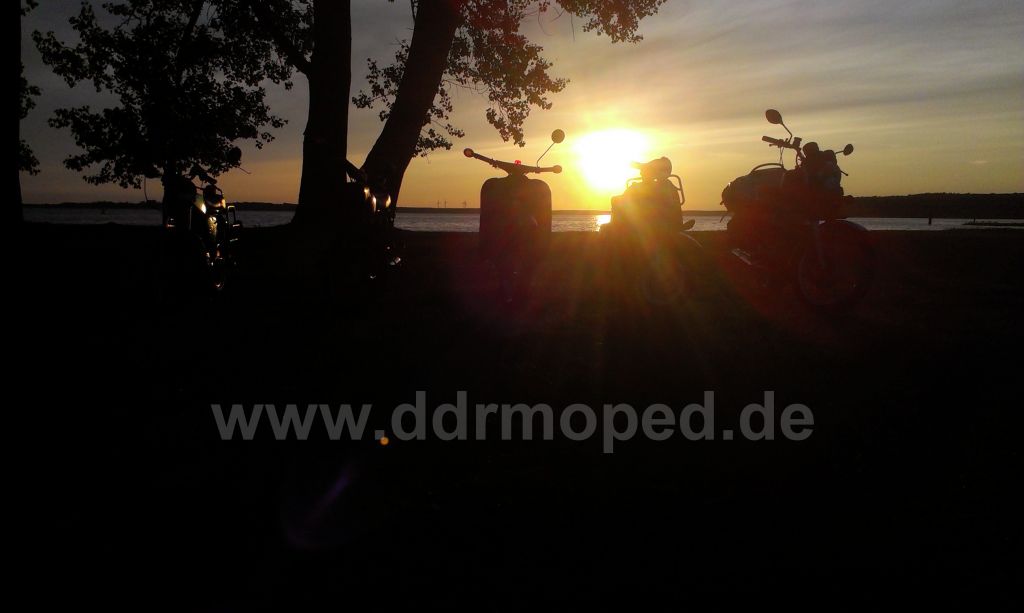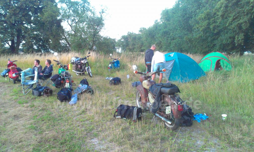 Bei Paul angekommen haben wir den Abend bei einem gemütlichen Grillerchen ausklingen lassen. Dabei muss noch gesagt werden, dass wir ja beihnahe vom Campingplatz geflogen wären, weil wir so gerast sind... Ich weiß nicht was manche Leute für eine Auffassung haben. Überall hat man nur ein Lächeln in den Gesichtern der Leute gesehen und Kinder zeigten lachend mit den Finger auf uns, aber wahrscheinlich fühlte sich Helge 500m weiter weg von unserem Mopedlärm bei ihrem Schönheitsschlaf gestört und musste gleich Meldung abgeben, dass wir zu schnell gefahren seien und es so doll gestaubt hat Aber egal, wir nahmen es gelassen und tuckerten von nun an im ersten Gang munter über den Platz Am Abend wurde dann die weitere Vorgehensweise beschlossen. Alles waren sich einig, das Ziel Ostsee muss geschafft werden. Also klingelte am nächsten Morgen um 8 der Wecker und gegen um 11 konnten wir dann Richtung Rostock (Warnemünde) starten.