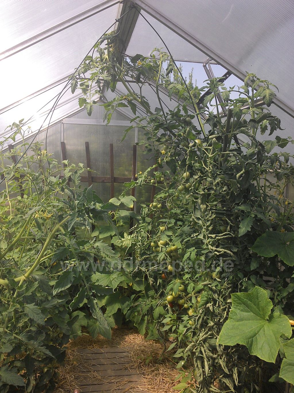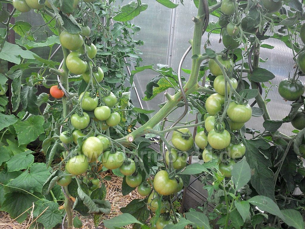 Vorn unten, die kleine Pflanze, ist übrigens aus einem abgeschnittenen Geiztrieb gezogen. Die habe ich aber nach dem Foto gleich entsorgt und mit bei den restlichen "Outtakes" auf der grünen Wiese eingebuddelt. Dort muß sie sich jetzt zukünftig auch ohne Wasser und Pflege als "Wildwuchs" behaupten (oder elend zugrunde gehen
