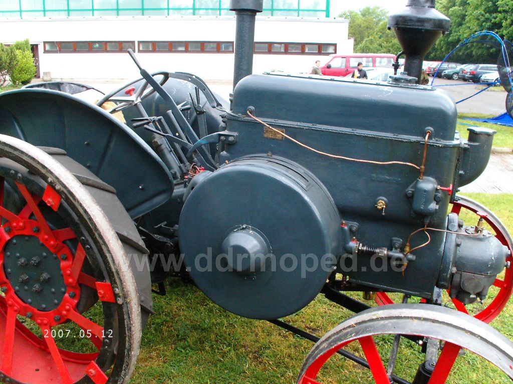 Hallo, Schön dass dich die ollen Karren auch interessieren! Also: Es handelt sich um einen 22/28 PS Verdamperbulldog Baujahr 1926 ( einer der ersten von der Sorte, erkennbar am großen Gusstank und dem hohen Luftfilter und dem Dampfventil) (aufm Bild der Graue), dann noch ein 38 PS Verkehrsbulldog von 1937 (noch alter Auspuff und Dreibackenkupplung, später gabs ne Scheibenkupplung und ist noch mit 38/45 PS angegeben)(Der mit den Kotflügeln und Dach). Beide Bulldogs haben den 10,3 Liter Einzylinder Glühkopf-Mitteldruck-Motor. Und dann ist da noch ein 25 PS Bulldog von 1942 (der kleine blaue ohne Dach) mit nur 7,4 Liter Hubraum. Bildchen: mfG Christoph