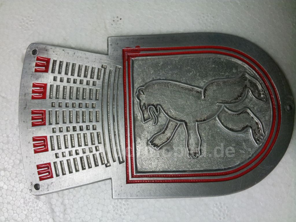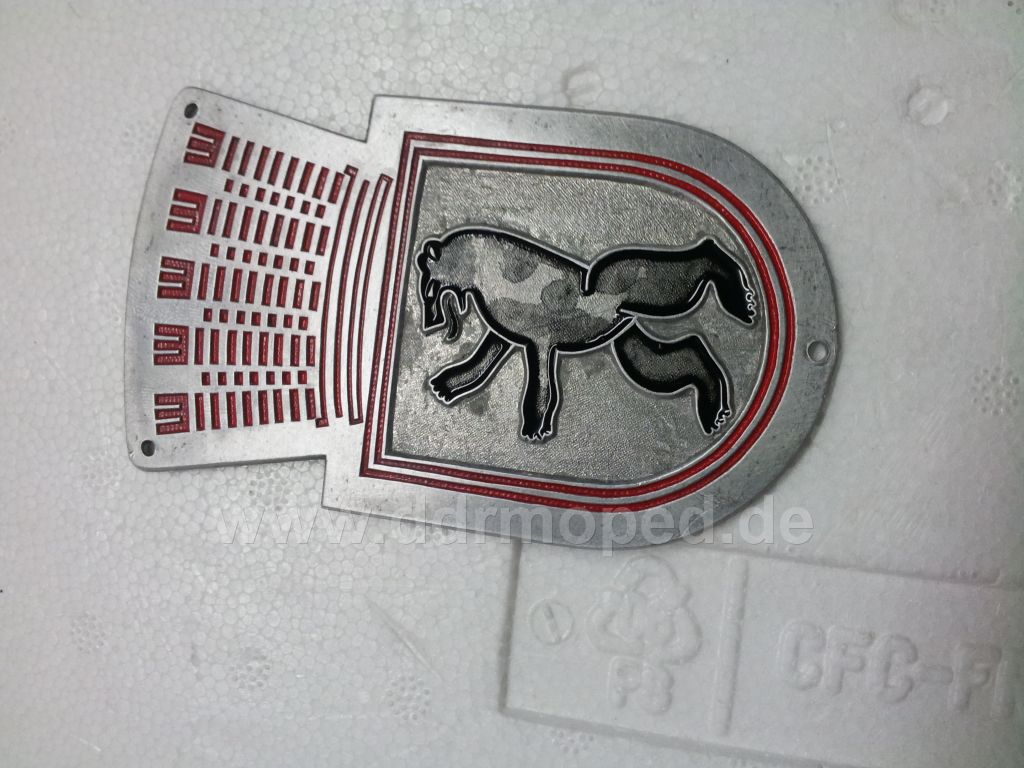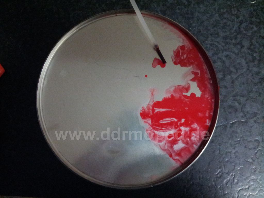 Sämtliche Farbreste müssen entfernt werden. Emblem in Nitro oder einlegen und einweichen lassen (verschlossenes Gefäß). Evtl. Reste in den Kanten mit feinem Schraubendreher vorsichtig auskratzen und mit Verdünnung sauber nachwaschen und trocknen lassen.