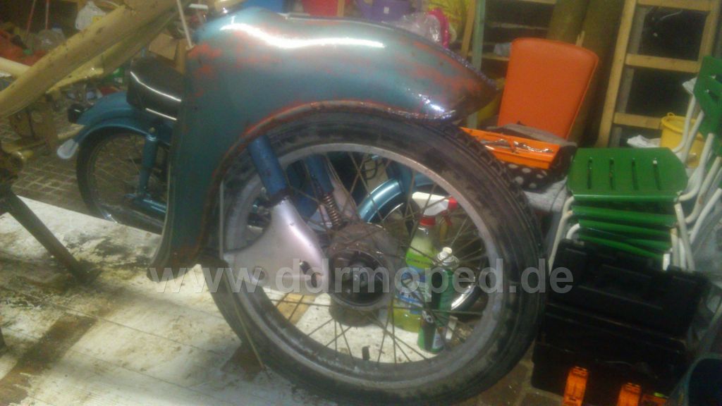 Na das nimmt ja allmählich Formen an. Passt denn die Pumpe nun? Frag doch mal im Teilemarkt wegen Schwingentausch. Ein Foto von der silbernen Kanzel und Knieblech, wo kein grauer Keil auf dem Tunnel ist, gibt es hier: Farbcode KR50Aber ob das Fahrzeug original so lackiert ist, weiß ich nicht. Die Lampe selbst ist ja auch blau. Auf dem Foto sieht das auch ganz anders als das übliche Hammerschlagblau aus. Die Karre dahinter ist ja auch in so einem komischen Weinrot. Also bestimmt restaurierte Fahrzeuge, die in einem Museum stehen. Hier ist noch ein Foto von Fahrzeugen, die nur die Kanzel silber lackiert haben. Hatten wir hier alles schon mal. Jens