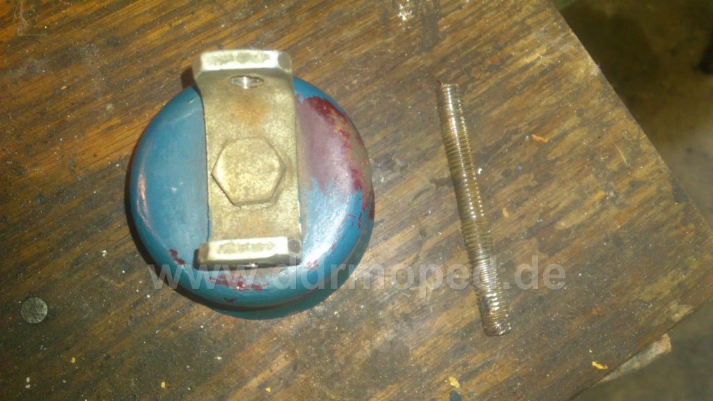 Dann habe ich die hintere Federung auseinander gebaut, da das Töpfchen (wie heißt das wirklich?) auch blau angemalt ist, darunter verbarg sich maron. Die Gewindestange ist übrigens hin, werde mir morgen auf Arbeit eine neue fertigen:
