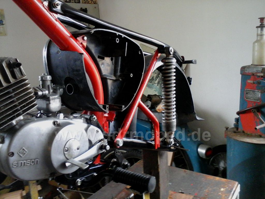 Ich habe wie schon oben geschrieben diese kleinere Rolle Förderbandgummi (also der Gummi ist etwas dünner als "echter" Förderbandgummi), aufgeschnitten, an beiden Enden ein Loch gestanzt und den Gummi zwischen Rahmen und Schwinge geklemmt, der sitzt jetzt so fest das man ihn nur noch abkriegt wenn man ihn durchschneidet.