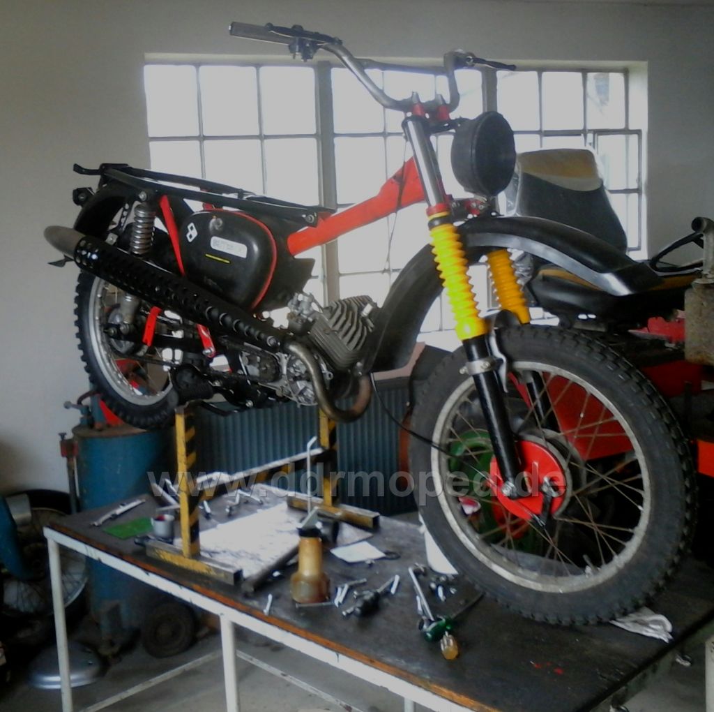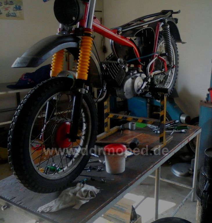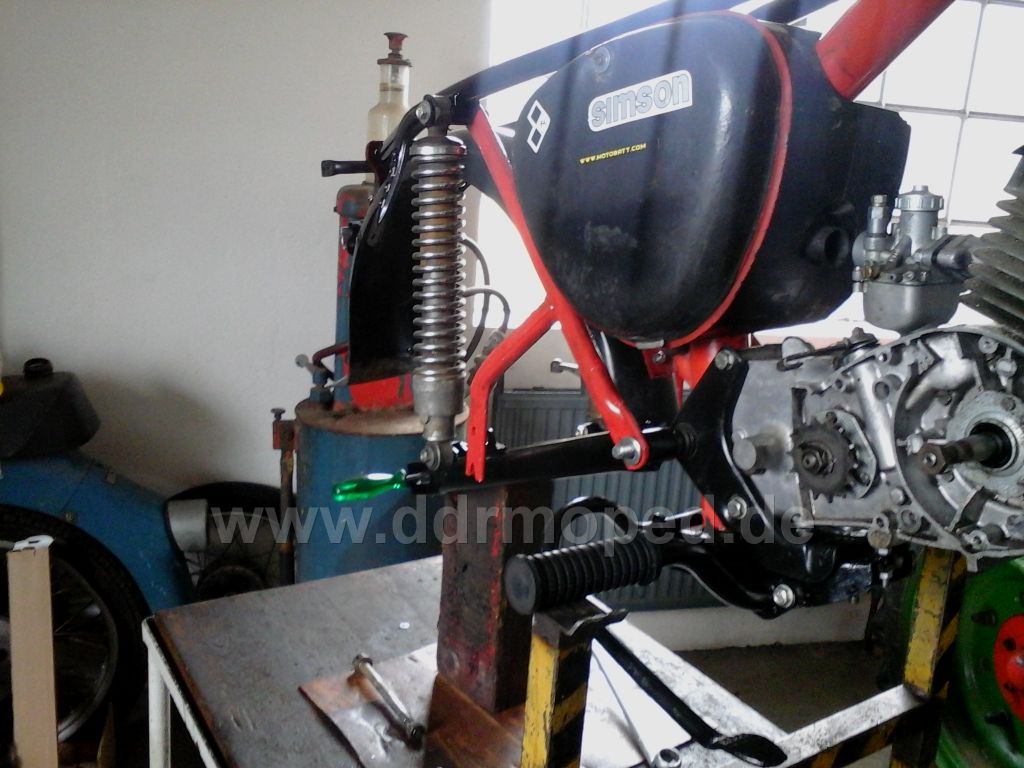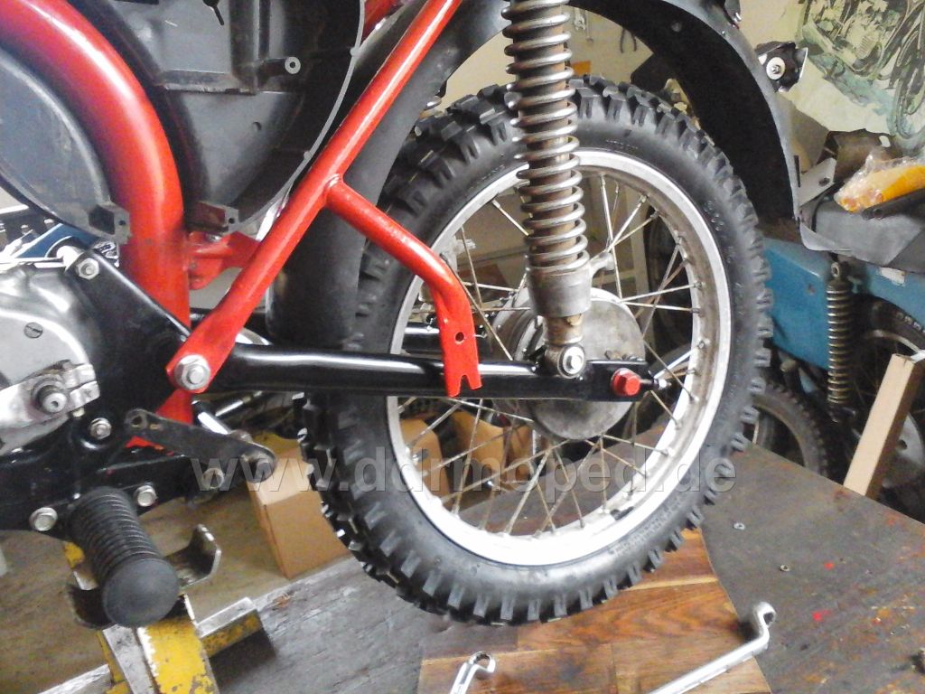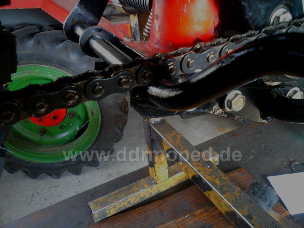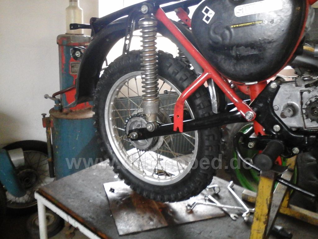 Als er dann auf der Schwinge war, befestigte ich ihn mit einem dicken Stück Draht. Am Bremshebel mache ich nichts, da die Kette nur an ihm schleift wenn er am Anschlag unten ist und ich habe die Bremse schon so eingestellt das er gar nicht mehr schleift.