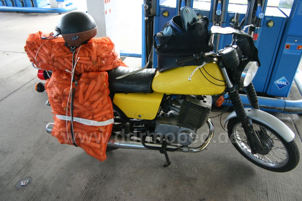 75 kg Futtermöhren! Meinen Nachbarn mit `ner 1200er Kawa ZRX (hoher Auspuff, SuperBike, kein Gepäckträger) hab´ ich gefragt, ob seine das auch kann...... MZ ist eben MZ. Die kann das! Gruß Joachim