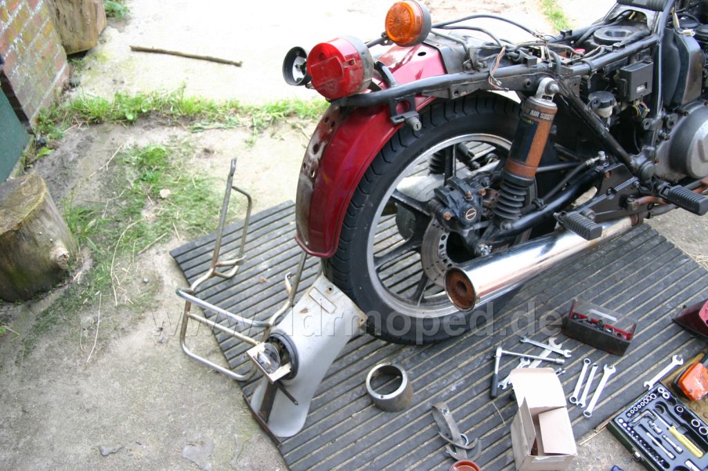 Erst mal das klobige Rücklicht u.s.w. weg.....und dann vielleicht TS Leuchteinheit dran.....TS 150/0 (ES) Kotflügelende ist vom Winkel her nicht perfekt - will sie hinten so kurz wie möglich machen, aber mit tiefem Schutzblech - vielleicht weite ich den Kawa-Flügel unten `n bischen, dann sieht `s klassischer aus - was meint Ihr?