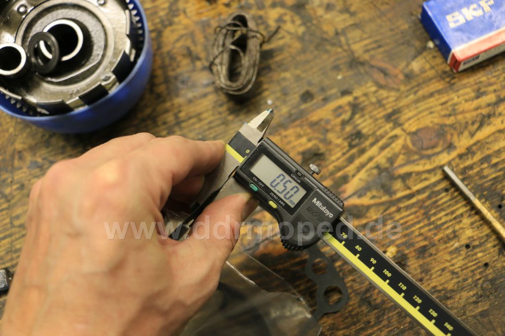 Völlig Wurscht, ob 0,3 oder 0,4 mm. Die fünf Hundertstel Millimeter darf die Kurbelwelle ruhig außermittig sein. Das bissel spielt keine Rolle, denn die KW soll am Ende ohnehin 0,2 bis 0,3 mm Axialspiel haben. Das liegt also alles innerhalb der Toleranzen, wenn die KW halbwegs mittig sitzt. Es sollen eigentlich nur möglichst solche krassen Fälle vermieden werden, wo am Ende die Kurbelwelle z.B. auf der einen Seite beispielsweise 3 mm Luft bis zur Kurbelhauswand hat und dafür dann vielleicht auf der anderen Seite schon an der Wand schleift. Dann hat der Motor nämlich möglicherweise Leistungsverlust, da das vorverdichtete Gasgemisch mit ungleichmäßigeren Strömungswiderständen rechts und links zu den beiden direkt darüberliegenden Überströmkanälen strömt und sich dann beim Spülvorgang die beiden Gasströme im Zylinder nicht gleichmäßig gegeneinander abstützen, wodurch es wiederum zu einseitigen Verwirbelungen in der Brennkammer, entweder mit Frischgasverlusten gleich direkt in den Auspuff, oder aber einer inkompletten Abgasausspülung kommen kann ... und bereits einmal verbranntes Benzin (= Abgas) das dann noch im Zylinder verbleibt brennt halt kein zweites mal ...  => Folge: Leistungsverlust! Mich irritiert aber ein bisschen, dass deine Motor-Mitteldichtung 0,6 mm bereit ist. Eine ganz schön dicke Pappe haste da, wodurch möglicherweise die Kupplungswelle ein zu großes Axialspiel bekommen könnte. Die Ausgleichscheiben der rechten Kurbelwellenseite kannst du erst ganz zum Schluß beilegen, wenn die Ölleitscheibe und das rechte Kurbelwellenlager montiert ist und alles wieder auf Zimmertemperatur abgekühlt ist. Dann kannst du mit dem Tiefenmaß den Abstand zwischen der äußeren Kante des rechten Kurbelwellenlagers und der Dichtfläche zur Dichtkappe hin ausmessen. Von diesem Maß ziehst du dann 0,2-0,3 mm vorgeschriebenes Axialspiel der Kurbelwelle ab und erhälst so das Maß der links noch beizulegenden Ausgleichscheiben. Dann kannst du die Dichtkappe mit dem Lichtmaschinen-Simmerring mit Papierdichtung und Bärendreck montieren.