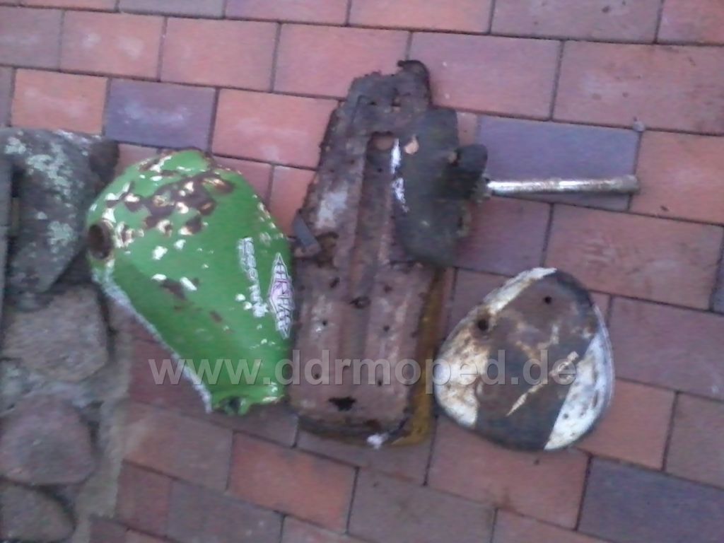 War bei McDonalds. Denk ich gehst mal an den alten Bahnschienen zurück, bist am schnellsten. Was ich da gefunden habe...meine Mutter hat nur gelacht Und nen Kumpel hat ein roten Original! Tank in der Garage hängen, den er auch dort gefunden hat. Mal sehen ob ich morgen noch mal hingehe, vielleicht finde ich ja noch nen Rahmen Fritz