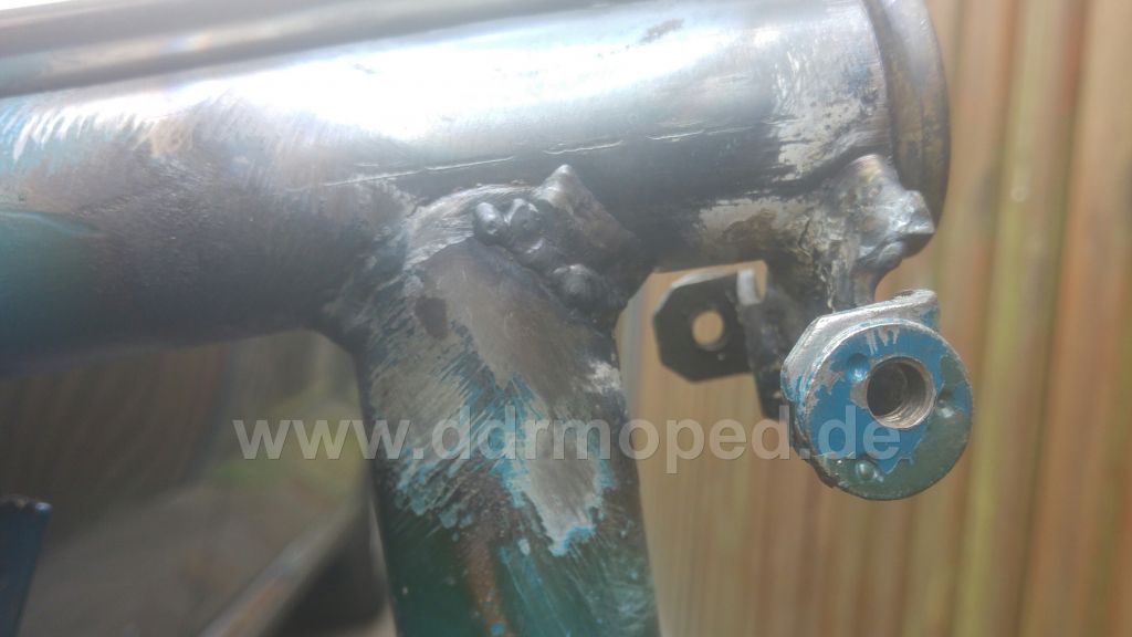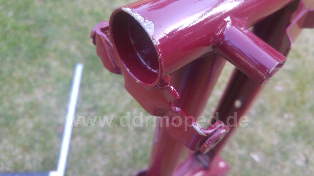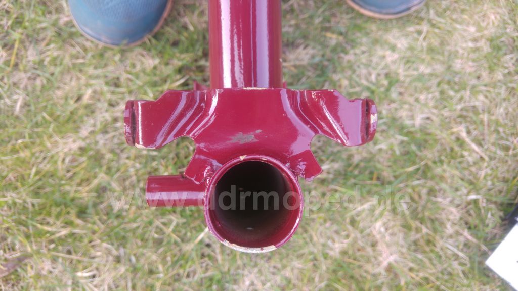 Dann hat sich noch ein großes anderes Problem eröffnet. Ich wollte den Rahmen zum lackieren abholen lassen. Dabei ist aufgefallen, das das Steuerrohr krumm ist