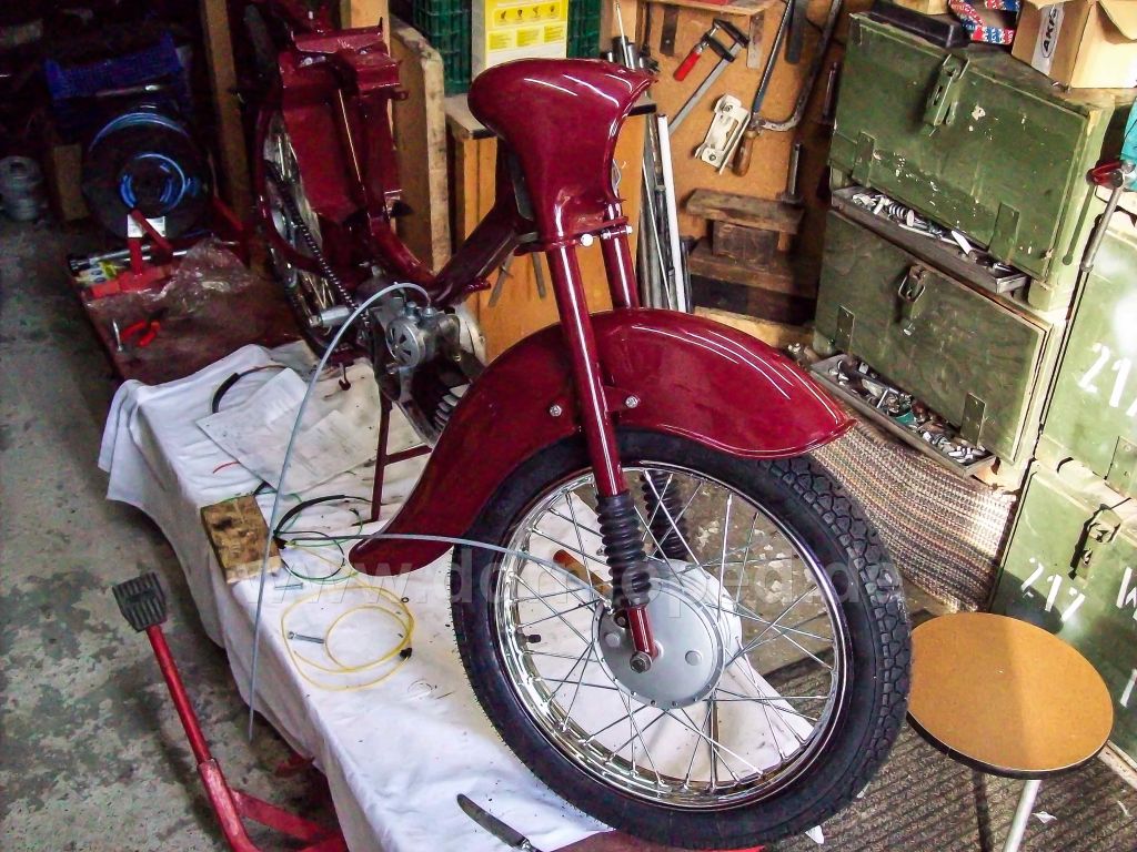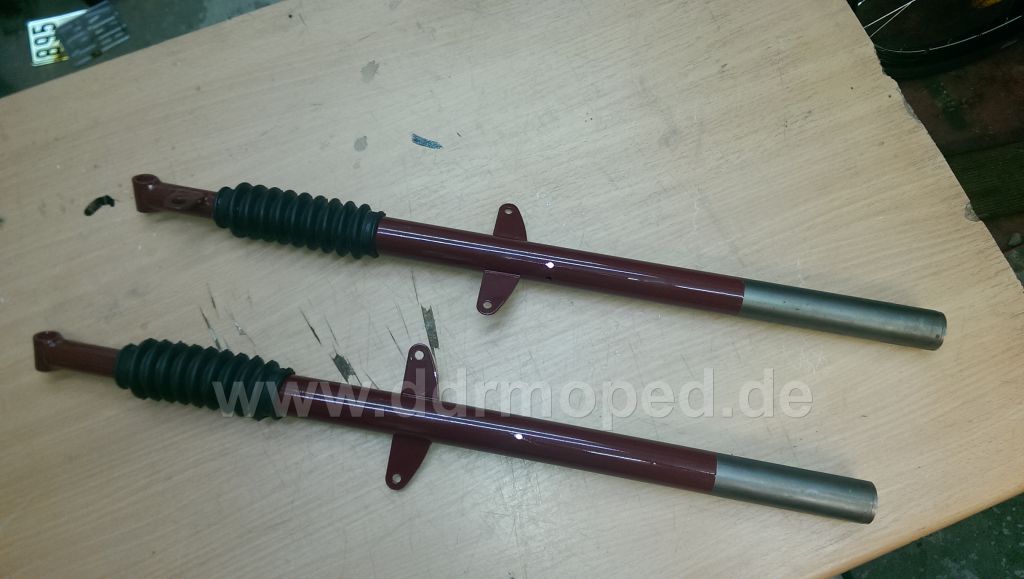 |  So die Woche habe ich die Teile vom Lackierer geholt und auch endlich einen brauchbaren Tank gefunden.     Also konnte es langsam ans zusammenbauen gehen. Telegabel mit neuen Hülsen und Bälgen..