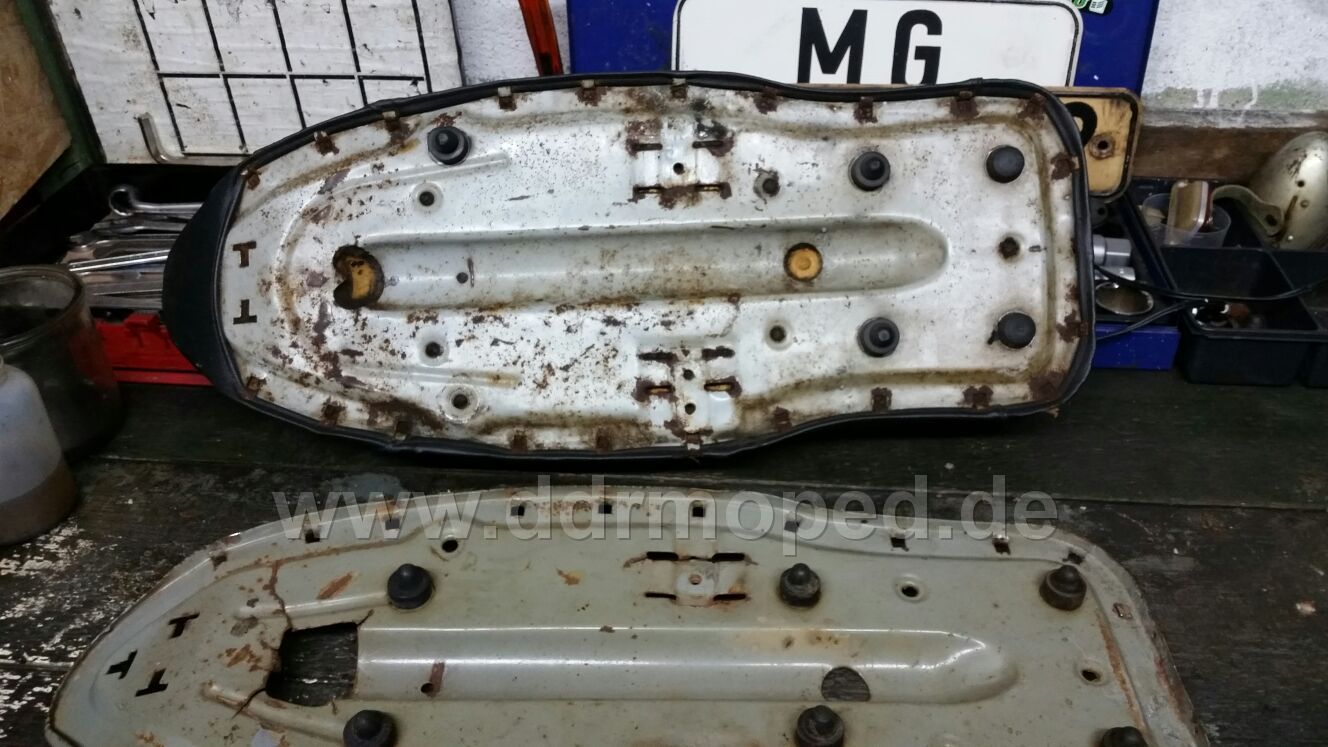 Am Wochenende habe ich eine graue Sitzbank mit Simsonschild bekommen. Bezug soweit okay aber das Blech komplett verbogen, gerissen und eingedellt.