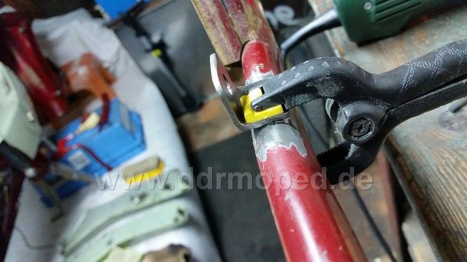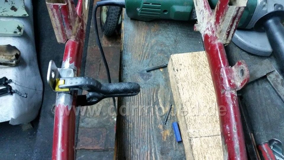 Und das Blech dann da auf die Schwinge drauf zu schweißen sollte doch auch eher eine der leichteren Übungen sein. Hinterher noch mit der Drahtbürste drüber, mit Pinsel etwas Grundierung drauf und zum Schluß rote Farbe draufgekleckst , fertig ist die "Euroschwinge 2016"