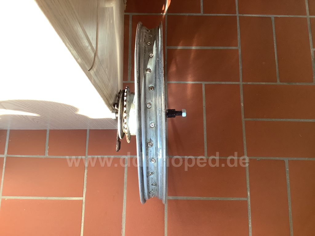 Problem gelöst, die Nippel mussten nur eine Punze weiter in der Felge. Allerdings muss das Kettenrad doch etwas außermittig laufen. Die Zentrierung auf Achsmitte kann ich anhand von 2 originalen Felgen nicht bestätigen.