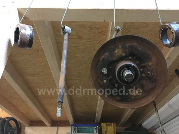 Als nächstes habe ich mich an die Montage der vorderen Radlager gemacht. Die Achsträger sind jetzt bereits gereinigt und vom schlimmsten Rost befreit. Da ich die Lager belastungsfrei mit Wärme und Kälte einsetze, sollten die Lager vor der Owatrol-Behandlung schon rein. Das Einsetzen hat wunderbar geklappt.