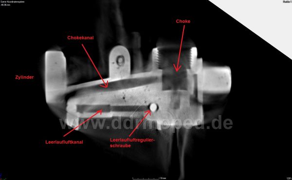 Eigentlich habe ich ja derzeit mit meiner Masterarbeit im Endstadium genung zu tun. Jedoch tat kann ich ja das Mopedaschrauben nicht lassen und hatte in der letzten Zeit diverse Fahrzeuge mit Versagerproblemen. Einer machte besonders Probleme. Beim Anfahren zeigten sich bereits Problem im Anzug und bei Gangwechsel fiel man beim Beschleunigen wie in eine Art Turboloch. Ultraschalbad, diverse Reinigungsaktionen, korrekte Neujustierung und eine komplett neue Bedüsung konnten das Problem nicht beheben. Schlussendlich wurde ein neuer BVF-Versager besorgt und siehe da, der Hobel rennt wieder. Jedoch wollte ich es nun genau wissen und habe den Versager mit auf Arbeit genommen. Und ja, ich habe ein CT von dem Teil gemacht. Nicht ganz einfach, aber möglich. Ich stelle erstmal unbearbeitete Bilder rein. Zum Einen kann man einen Eindruck von dem Bauteil gewinnen und zum Anderen eklatante Fertigungsfehler erkennen. Ich sag nur soviel .Wer absolut alle Register zieht, um einen DDR-Versager einzustellen und es einfach nicht gelingen will, kann ruhig auch die Hypothese aufstellen, dass das Ding schlecht gefertigt wurde. Und ja, dazu gehören auch DDR-Originalteile.