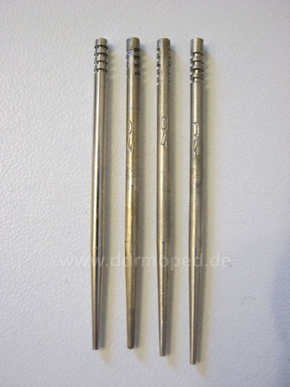 So heute mal alle Vergasernadeln rausgekramt die ich bei mir finden konnte. (von links nach rechts) Nr 1: eine Nachbaunadel, die man im NKJ-Set für die 153er Vergaser bekommt. 4 Kerben komplett umlaufend, 43,94mm lang, 2,03mm dick, glattes Ende unten. Nr 2: 04er Nadel. 4 Kerben nur seitlich, 43,85mm lang, 2,00mm dick, rundes Ende unten. Nr 3: DIESE 04er Nadel, war in dem Star Vergaser drin (NKJ 153-6), genau die Gleiche ist auch in der Schwalbe von mir drin. 5 Kerben nur seitlich, 44,84mm lang, 2,02mm dick, rundes Ende unten. Nr 4: 04er Nadel. 4 Kerben komplett umlaufend, 46,07mm lang, 1,99mm dick, glattes Ende unten. ..... WER Weiß mehr dazu.????? und eine 05er Nadel wäre mal interessant zu sehen im Vergleich dazu.