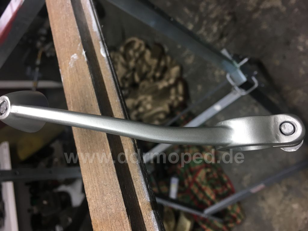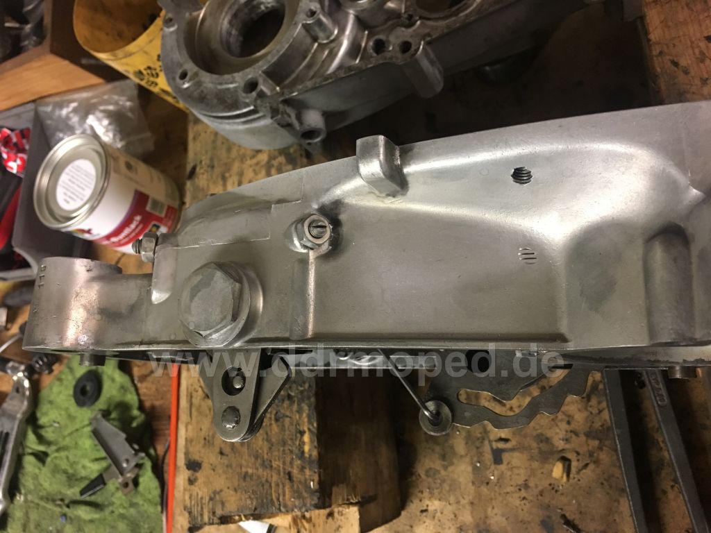 diesem hier ganz vorsichtig ein paar Zehntel Millimeter in die richtige Position getrieben und das so entstandene "Ei" (Langloch) dann mit diesem Werkzeug wider ganz vorsichtig halbwegs rundgefeilt. Dann war die Bohrung in der richtigen Lage und dann habe ich Ø 5,5 mm, dann Ø 6 mm aufgebohrt, nachgemessen und dann, wenn ich mich recht erinnere auf Ø 6,4 mm gebohrt. Das war, glaube ich, das Maß, dass die Schaltwelle dort an dieser Stelle hat und somit die Bohrung haben muß. Bin mir aber nicht mehr ganz sicher, da das inzwischen schon ein paar Jahre her ist. Also selber noch mal ausmessen!