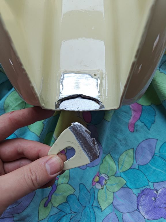 Das Ankleben der abgebrochenen Lasche bringt da nichts. Die Kontaktflächen der Bruchenden sind viel zu klein, um dort eine stabile Klebeverbindung zu gewährleisten. Außerdem sind die Schwingungen und Vibrationen viel zu groß, als dass das halten könnte. Du solltest dir im Schraubstock aus einem 2 mm dickem Stahlblech eine neue Haltelasche nach Vorlage der alten bauen, im Bereich der Schweißnähte allerdings rechts und links etwa 2-3 mm schmaler, und diese dann direkt auf die abgebrochene alte Lasche über die alten Schweißnähte hinweg nach Art einer kleinen Kehlnaht aufschweißen (MIG). Vorher die alten nach oben überstehenden Schweißnähte etwas glätten, damit die neue Lasche dort eben aufliegt. Das habe ich vor Jahren auch schon mal so gemacht und hat funktioniert, allerdings mit einem 3mm dicken Blech. Ich war vorsichtig und habe nach dem anheften nur kurze Strecken geschweißt und wieder abkühlen lassen, so dass der Lack hinten an der Tankaußenseite nicht sehr viel Schaden genommen hat. eine leicht Verfärbung habe ich mit neuer Farbe mit einem Tuschkastenpinsel übertupft und innen wo man es nicht sieht neu gepinselt. Außerdem ist dort das vordere Sitzbankende, so dass die Stelle dort sowieso nicht groß sichtbar ist.