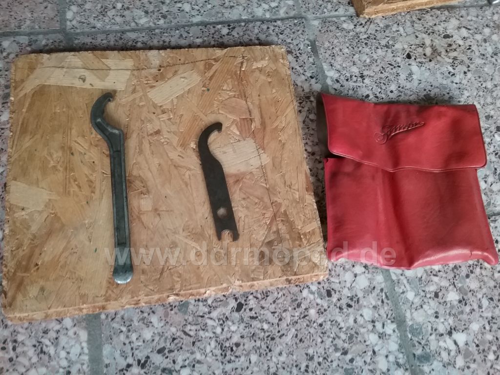 Den linken MZ Schlüssel nehme ich immer zum Krümmermutternnachziehen. Das erklärt auch vielleicht, warum der Beinschutz teilweise stört. Das Werkzeug habe ich auch konserviert, da Flugrost anhaftete. Ohne anständiges Werkzeug geht es nicht!