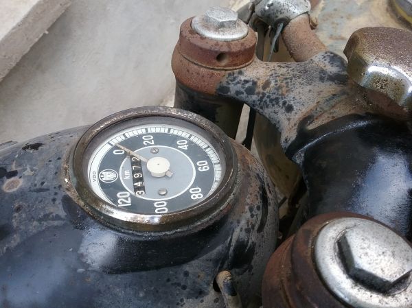 Als er in Frührente ging, hielten wir noch weiteren Kontakt. Zwischenzeitlich hatte er das Fahrzeug vom Boden seines Bruders zu sich geholt und wollte es restaurieren. Irgendwann hieß es, daß er sich überfordert fühlt und ihm, da ich mich ja dafür interessiere, eine fahrbereite TS 250/1 mit Drehzahlmesser geben soll, als Tausch. Natürlich wollte ich keine von mir hergeben. Also guckte ich was der Markt hergab und mußte ihm mitteilen, daß es so von meiner Seite aus nichts wird. Vorher hatte ich sie mir natürlich schon einmal angesehen. Es war ein Victoria KR 26 Aero Sport.