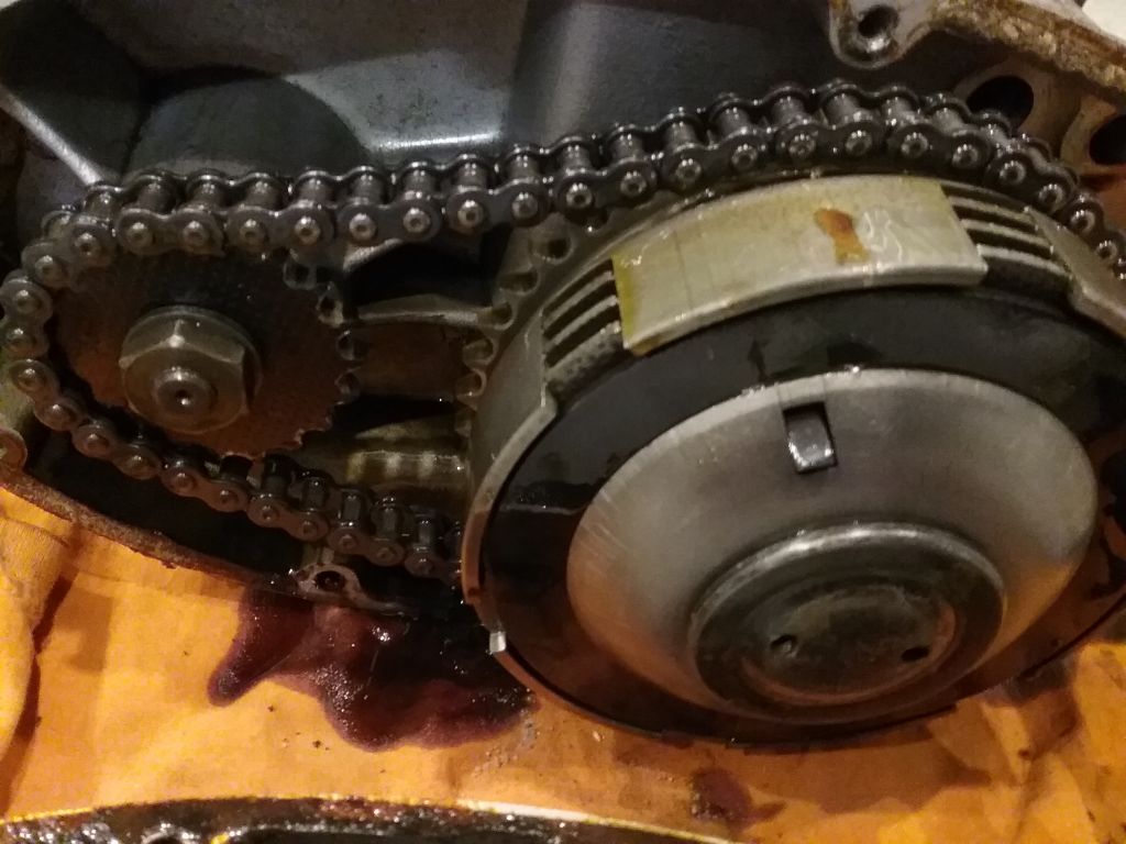 Ich habe mal versucht die Mitten der Zähne zu markieren. Das Primärritzel ist zu schmal und schwarz. Dies ist keines für die KR 25 Motoren. Die Kette läuft schräg.