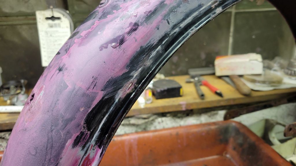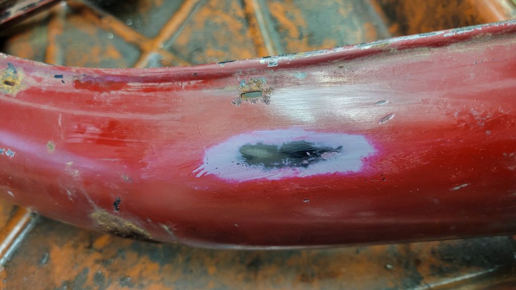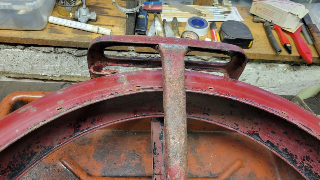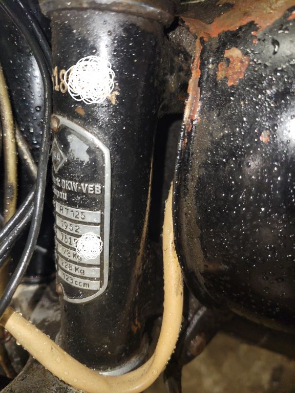 Soviel zum Ausgangszustand. Der Plan war von Anfang an eine erhaltung des Originallack, auch wenn sich die RT mittlerweile mit einigen Überraschungen dagegen versucht hat zu wehren. Zum einen ist der Rahmen an einer Stelle gerissen, die Telegabelrohre waren durchgerostet  und auch die Achsfaust Hinten Links war stark eingerissen. Aich der Tank war am/Im Werkzeugfach durchgerostet.