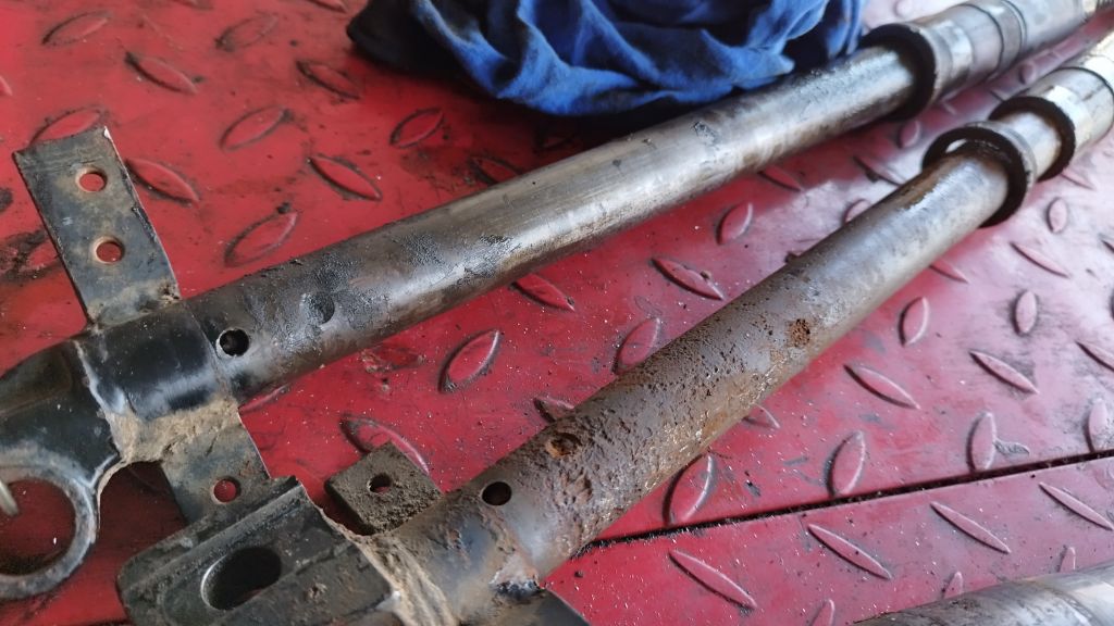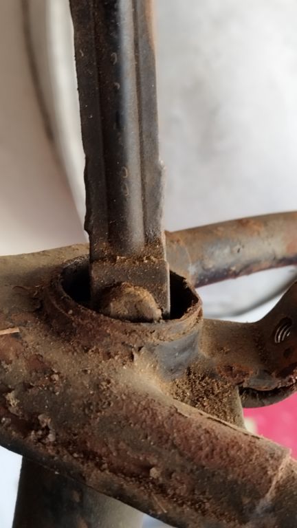 Die absolute Härte war heute das Sattelrohr im Rahmen, es hat unglaubliche 3 Stunden gedauert, eh ich alle Reste der vollkommen vergammelten Sattelfeder heraus bekommen habe. Jede Menge Geduld,  ein kräftiger Draht hakenförmig gebogen, und eine verlängerte Drahtbürste haben dabei geholfen. Stück für Stück kam immer nur Bruchstücke raus, weil sich früher im Rohr offensichtlich Wasser und Dreck angesammelt hatte, der aber nicht abfließen konnte. Das habe ich gleich geändert, obwohl im Rahmen eigentlich eine Öffnung dafür vorgesehen war? Siehe Foto, wo eine Art Stopfen eingeschweißt wurde.