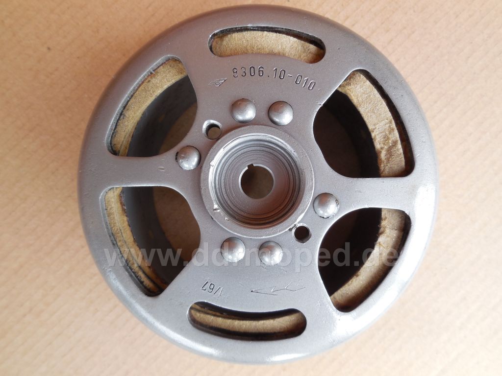 Das Polrad ist aber erst ab Sommer 1966 zum Einsatz gekommen, als die rechten Kurbelwellenzapfen einen Konus von 1:5 hatten . Erkennbar an der "10" in der ET-Nr . Das alte Polrad für Konus 1:10 hatte als ET-Nr 8306.8-010 .