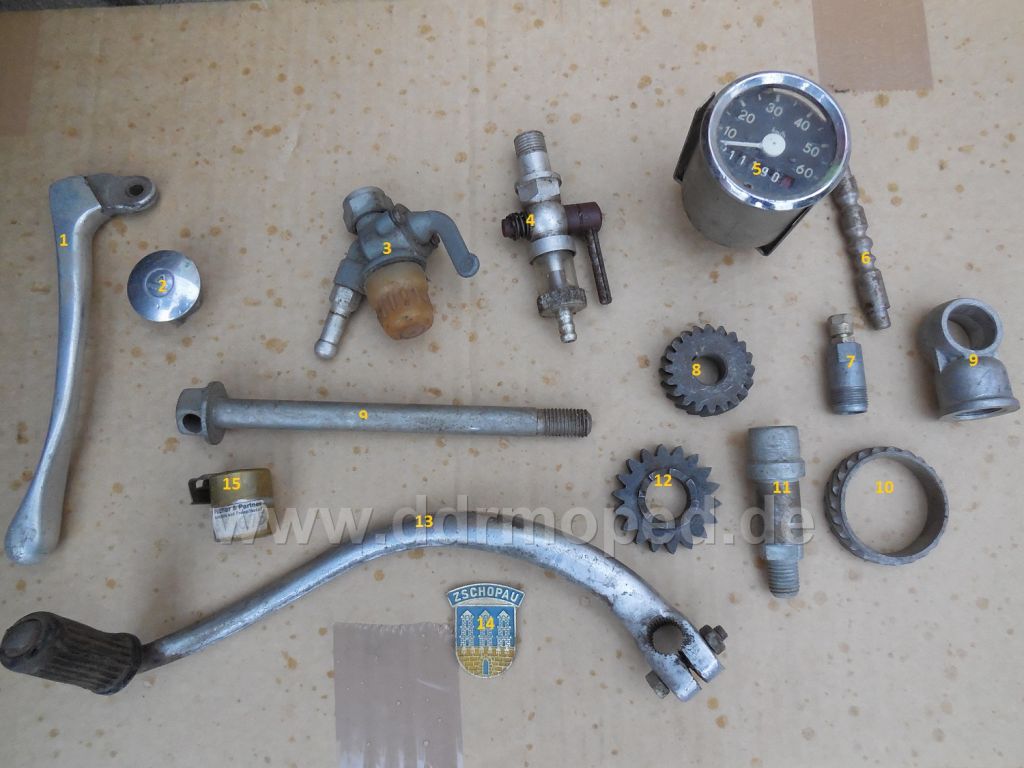 3: Benzinhahn Vogelserie (Ich würde mal wegen dem Alunippel sagen, Spatz/ früher Star?!) 5: Tacho S50 6: Diese Rastwelle wo die Schaltklaue für den alten 3-Gang Somsonmotor geführt und rastet wird. 7: Schock für den 16N1 Vergaser (16N3 weiß ich jetzt nicht. könnte aber auch passen...) 8: Primärzahnrad Simson alter 3/4 bzw. neuer 3/4 Gangmotor. 9: Dämpferauge vom Reibungsgedämpften Stoßi Schwalbe, Star, Spatz,... 10: Sieht aus wie der Tachoantrieb von der S51 nur das es den Zahnkranz abgeschert hat. 11: Achverlängerung (Passend zur Achse in der mitte) für Simsonmopeds. 12: Kickstarterzahnrad alter 3-Gangmotor Simson.