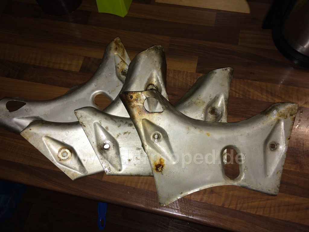 War heute in einem feuchten Keller und habe im Schutt gewühlt. Zwischen völlig verrosteten Mopedteilen als Zeugnis jugendlichen Schraubens in der DDR lagen die im Bild befindlichen Teile. Zustand wirklich gut, kein Riss oder mal ein Stück rausgeschnitten. Da wird einem auch klar, warum die eigentlich fast immer fehlen. War lästig beim Basteln, Hauptsache fährt.