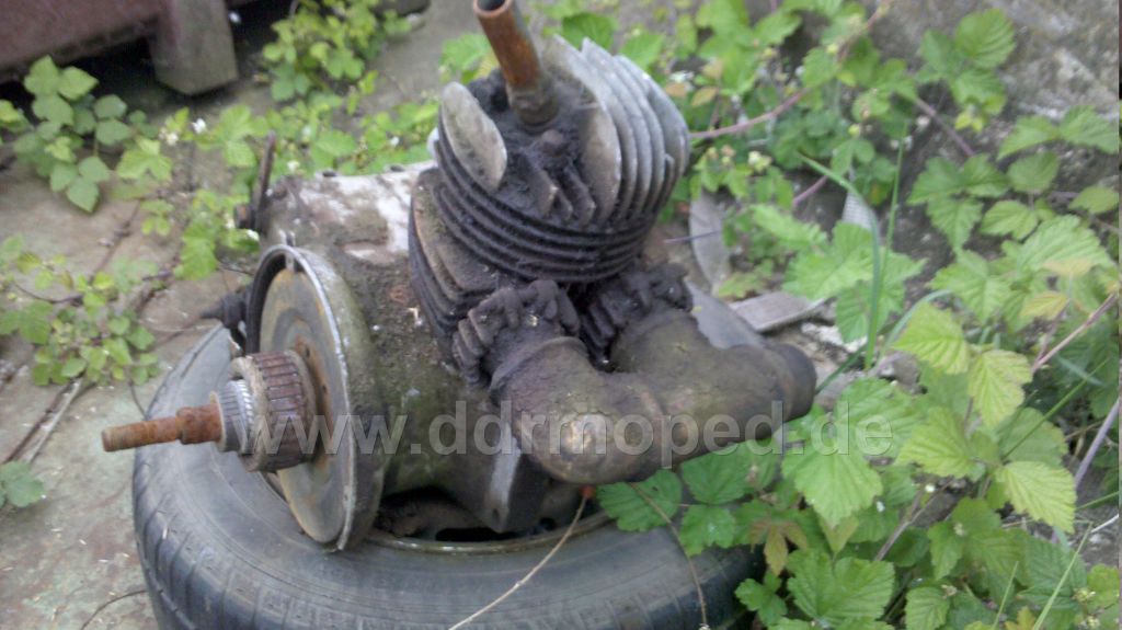 Er hat gewisse ähnlichkeiten mit Jawa, aber diese Große Flache Fläche wo anscheinend nen Deckel noch über die Lichtmaschiene kommt lässt auf eine Zwangskühlung deuten... also vielleicht ein Roller? Aber den Sinn dieser tollen Wasserrohre als Krümmer kann ich mir nicht erklären