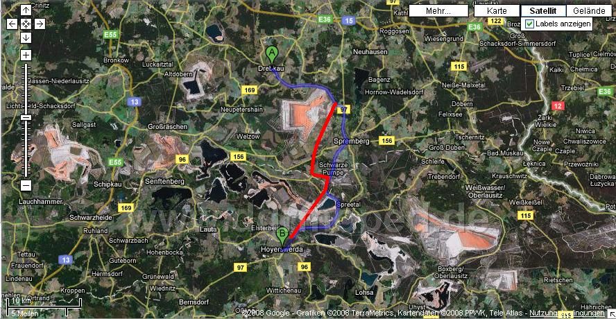 Ich würde so fahren (und da gibt es schöne Nebenstrassen): Grossköris, Halbe, westlich an TRopical Island vorbei straight durch bis Lübben (immer möglichst nahe an der A13 dran), hinter Lübbenau die Autobahn gequert nach Calau, dann Drebkau-Spremberg. Spremberg-Hoyerswerda würde ich nicht tun, es ist ein Umweg. Eher die östliche Variante Spremberg-Uhyst-Guttau-Baruth-Hochkirch. In Hochkirch kann ich Euch abholen. Es ist landschaftlich schön, Nebenstrassen und auch kürzer. Leider kriege ich die markierte Earth-Strecke nicht verschickt. Es ist dafür auch keine Navi nötig, nur eine normale Deutschlandkarte. Überlegts Euch nochmal. |