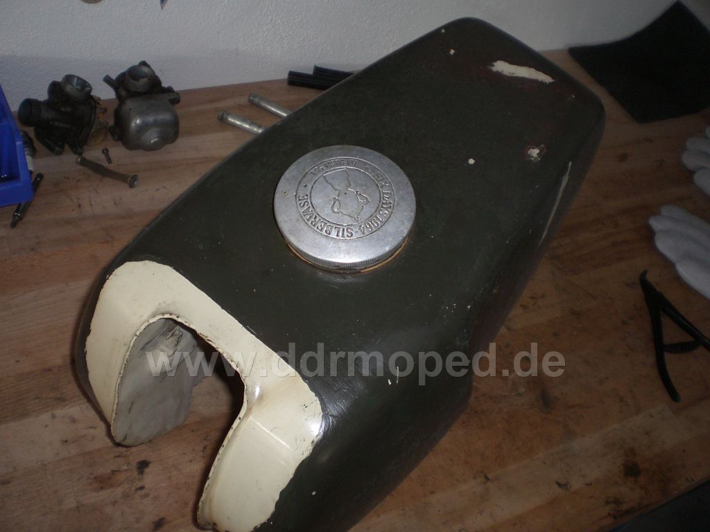 Da kommt ein Verbindungsschlauch ran, die die beiden Tankhälften miteinander verbindet. Somit braucht der Sprit nicht über die Rahmenrohraussparung schwappen, wenn der Tank fast leer ist. Das vermisse ich an meiner S50 am Meisten, wenn der Tank fast leer ist, muss ich die immer auf die Seite legen, damit Sprit´nachläuft.