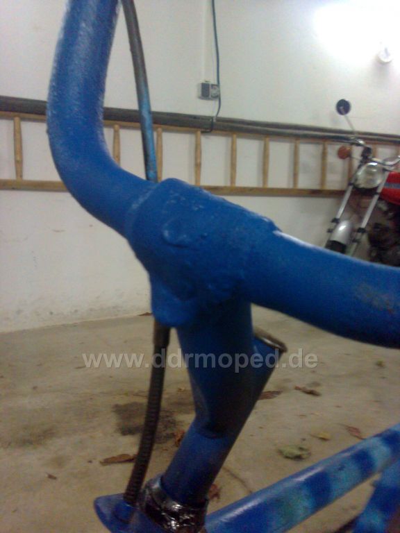 Ich arbeite für mich gerade eine frühe blaue 64er Schwalbe auf. Die hat diverse kleine Lackschäden, die mal mit DDR Pinsellack übermalt wurden. Abbeizer hat das Zeug gut entfernt. Nach entsprechender Vorbereitung konnte ich die Stellen mit Lack vom DOC ausbessern. Die Farbe passt an den meisten Stellen zu 99%, würde ich mit meinen Augen behaupten.Absolut top. Polieren lässt sich so ein alter Lack auch wieder auf einen schönen Glanzgrad. Vorher: