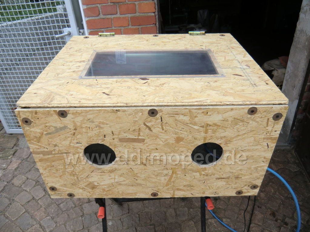 Ich hab mir mal eine Sandstrahlkabine gebaut, ist noch etwas optimierungsbedürfitig in Sachen Lampe und Scheibe, aber ansonsten erfüllt das Teil seinen Zweck zu meiner Zufreidenheit. An der Box wurden bis auf Scharniere, Griffe und Scheibe nur Teile verwendet, die noch bei mir rumlagen, also sozusagen ein Low-Budget Projekt
