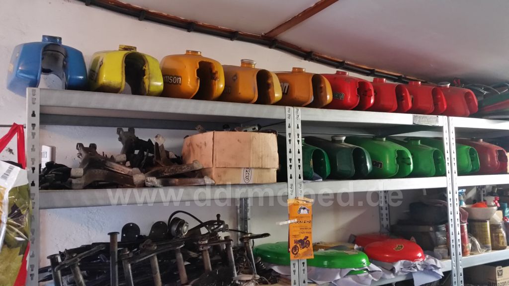 Wenigstens sehen die Tanks, passend zur Zeit, aus wie Ostereier. Was allerdings die Sättel an der Wand sollen?  Erinnert an die Trophäensammlung eines Großwildjägers. Man könnte auch schöne Barhocker aus einer verlängerten Originalsattelstütze und Chromkrähenfuss daraus bauen.Manche Leute hängen sich ja auch alte Wagenräder und so ein Zeug an die Fassade, obwohl es dafür keine historischen Referenzen gibt. Zu Tinos Ehrenrettung muss ich aber sagen, dass dieser sich auch bei Bedarf eines Suchenden von einer Trophäe für die gute Sache trennen würde.