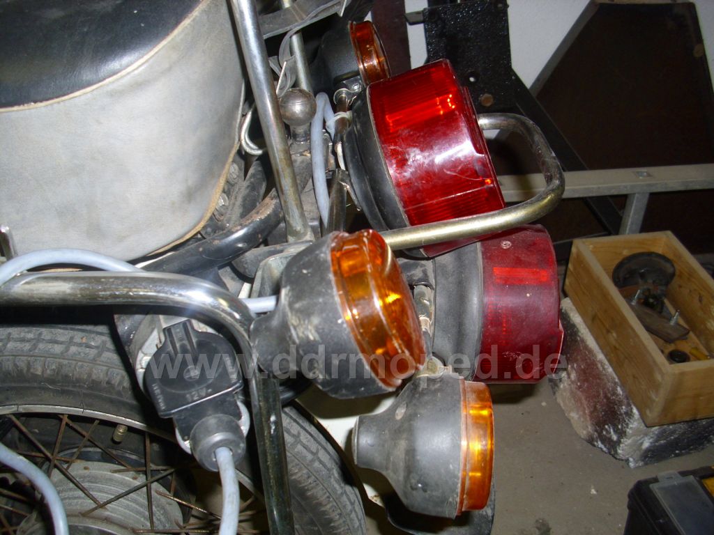 Maik, sorry, hab dich net endeckt, ich wurde endeckt... Aber ne Bierkiste hab ich gesehen... Also schnell mal Blinker umkabeln, dazu hab ich mein Virtuellen Anhänger mal sinnvoll genutzt. Wußte garnet, das die 12V-Birnen bei 6V noch recht hell leuchten, eigentlich war ich nur zu faul, die Birnen zu wechseln. Schaut auch gut aus im Gepäckträger. Zum Testen nur vom Anhänger habe ich eine Steckdose in einem Kasten mit 7 Bananenhülsen. Die sind von 1 bis 7 nummeriert und würde auch am PKW-Hänger gehen...