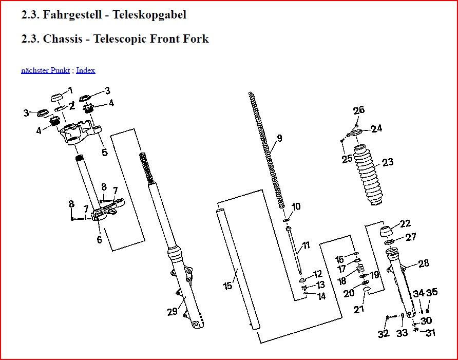 | QUOTE (Otto @ 07.11.2025, 15:05) | Ich kenne die MZ Telegabel nicht. ABER wenn ich mir die Zeichnungen im Netz ansehe, dann ist der Simmering (in der Zeichnung Nr. 27) durch den Sprengring (in der Zeichnung Nr. 21) im Gabelrohr gesichert. Genauso kenne kenne ich das auch von allen anderen Gabeln. Der Sprengring kostet 1,90€. Würde ich erstmal so versuchen, bevor ich das irgendwas mit Karosseriedichtmasse verklebe. Du musst doch sehen, ob es in dem Gabelholm eine Ringnut für den Sprengring gibt, oder nicht?