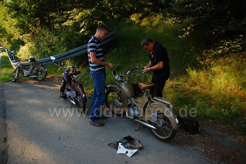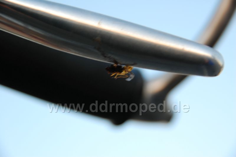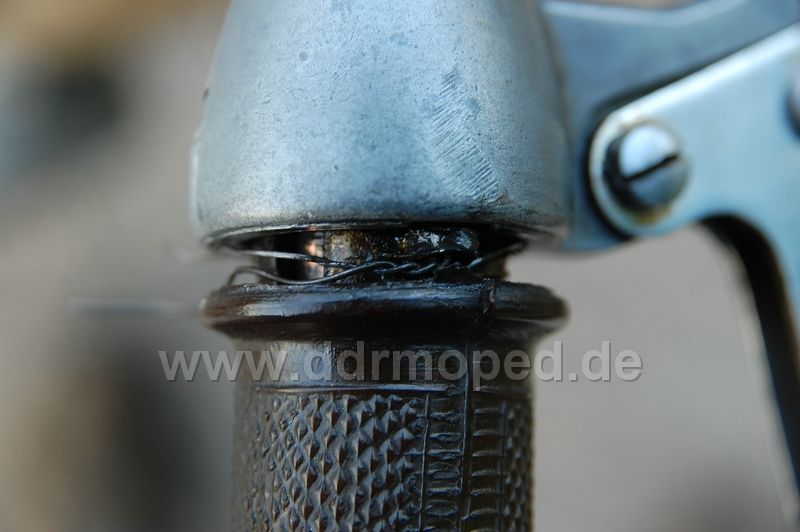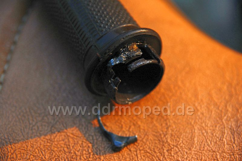 Und dann war es passiert. Bergrunter schön laufen lassen, das ist eine Stelle, wo sehr schöne Serpentinen sind. Und plötzlich hatte ich meinen Gasgriff in der Hand... Die Aufnahme des Bowdenzugnippels war auf einer der beiden Seiten weg gerissen! Na bloß gut, dass Sebastian Draht mit hatte, sonst wären wir echt aufgeschmissen gewesen!!!