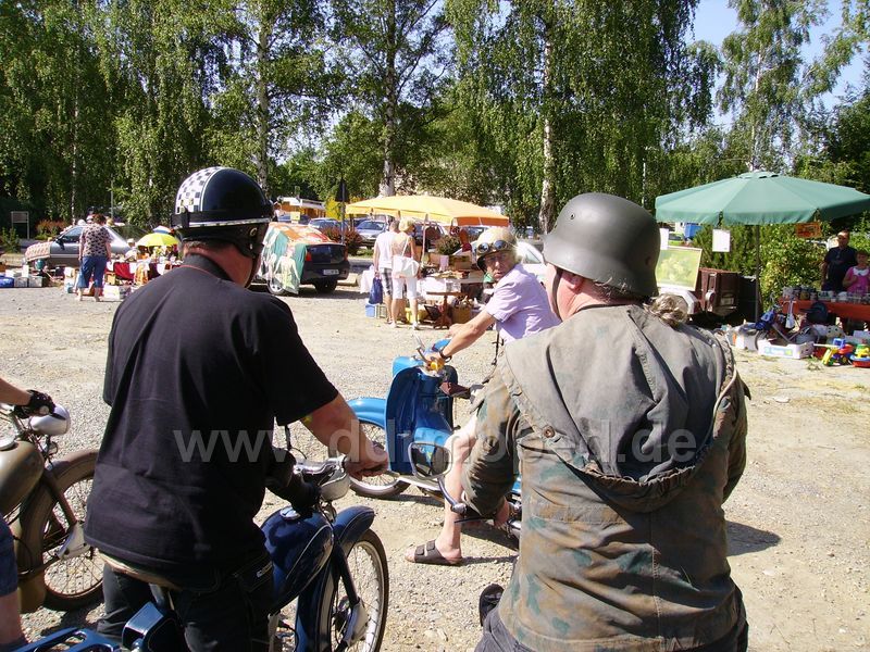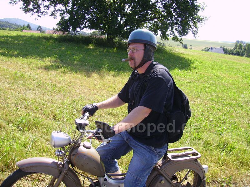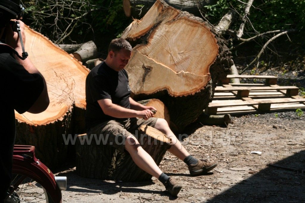 Und als Letztes für Heute: Der Schmied ist ja ein ideenreicher Mensch. Hier ist Probesitzen und überlegen, wie da ev. eine Gabel ran könnte, 2 Räder, den Motor müsste man unten "einfräsen"...Die Sitzpositzion ist schon mal gut. Gekauft. Holz ist für ihn eine neue Herausforderung.