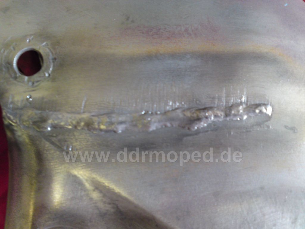 Da heute ja mein vorrangiges Projekt kurz vor der Vollendung wieder zum Erliegen gekommen ist, hab ich mir noch mal den Rahmen vorgenommen... Die beliebte Stelle oberhalb des Ständer´s ist ja natürlich auch bei mir gerissen... Aber egal, nach dem Erlebten von heute, brauchte ich das zur Entspannung... Also erstmal schön grossflächig den Gefahrenbereich entlackt, was ja relativ schnell von der Hand ging... Daraufhin erstmal grob den Schlatz geheftet, als Überlappstoss... Die Millimeterscheibe auf die Flex gespannt und ruckzuck wurde aus dem Überlappstoss eine I-Naht im weitesten Sinne...und schön eng wieder heften um den (unbeliebten) Verzug grösstmöglichst zu auszutricksen...