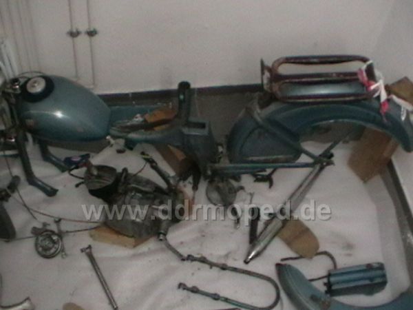 Hallo liebe Leute, als ich heute Nachmittag den neuen hammerschlagblauen Lack von doccolor in den Händen hielt, konnt ich dies kaum fassen: Ich hatte doch erst gestern Abend überwiesen! Die anderen Teile wie einen Kettenschutz, Spiegel, Satteldecke, Pedalen und einiges mehr sind bereits bei ebay bestellt und müssten eigentlich auch bald kommen. Warscheinlich hat man mich bei dem Tachoantrieb übers Ohr gehauen, der sollte vor 2 Wochen da sein. NICHTS!  Nun gut, ich habe mich vorhin mal ans Auseinanderbauen gemacht, hier dazu ein paar Bilder, was ich so nach einer Stunde geschafft hatte, als mir der Schweiß aufs Moped tropfte, endscheid ich mich für ein kühles Getränk vor dem Computer: Davor: