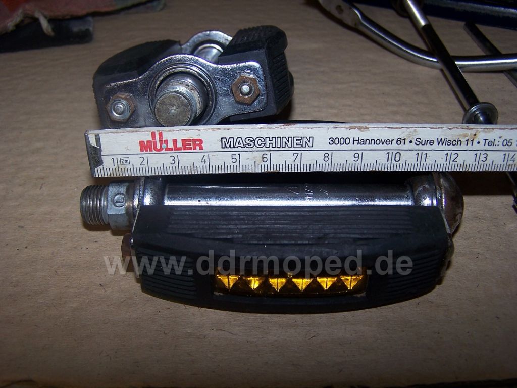 Die Simson-Prägung passt zum Baujahr, es scheinen aber keine ausgesprochenen Damenpedale zu sein (Gummis dann ca. 80 mm lang). Interessant ist auf jeden Fall auch die gewölbte Form der Gummis