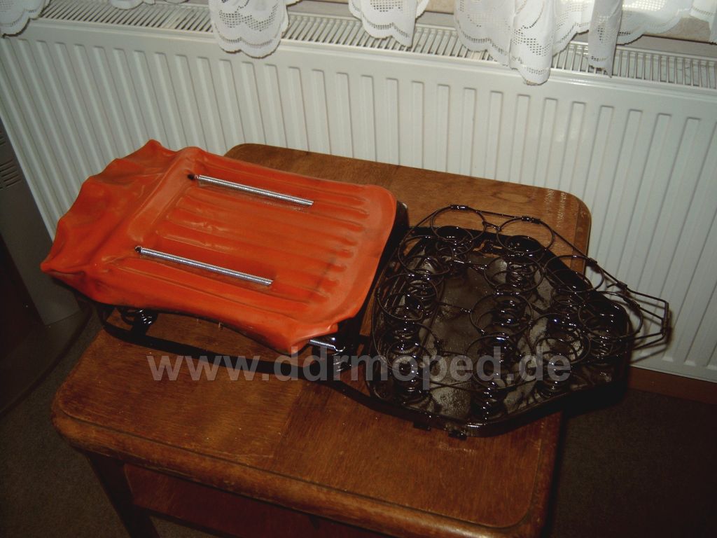 Die alte Gummiauflage war noch verwendungsfähig... Das Beziehen der Sitzbank ist nicht weiter kompliziert, nur muß man mit etwas Überlegung arbeiten. Der Bezug muß stark gespannt werden, mit einer Schraubzwinge kann man für etwas Entlastung sorgen.