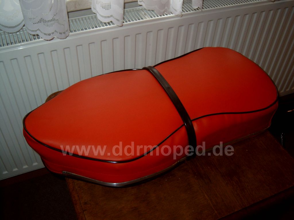 Die fertiggestellte Sitzbank! Als ich bei der Demontage den schwarzen Schonbezug entfernte, zeigte sich darunter ein roter Bezug. Das rote Leder paßt gut zur schwarzen Lackierung, insofern entschied ich mich auch wieder für rot.