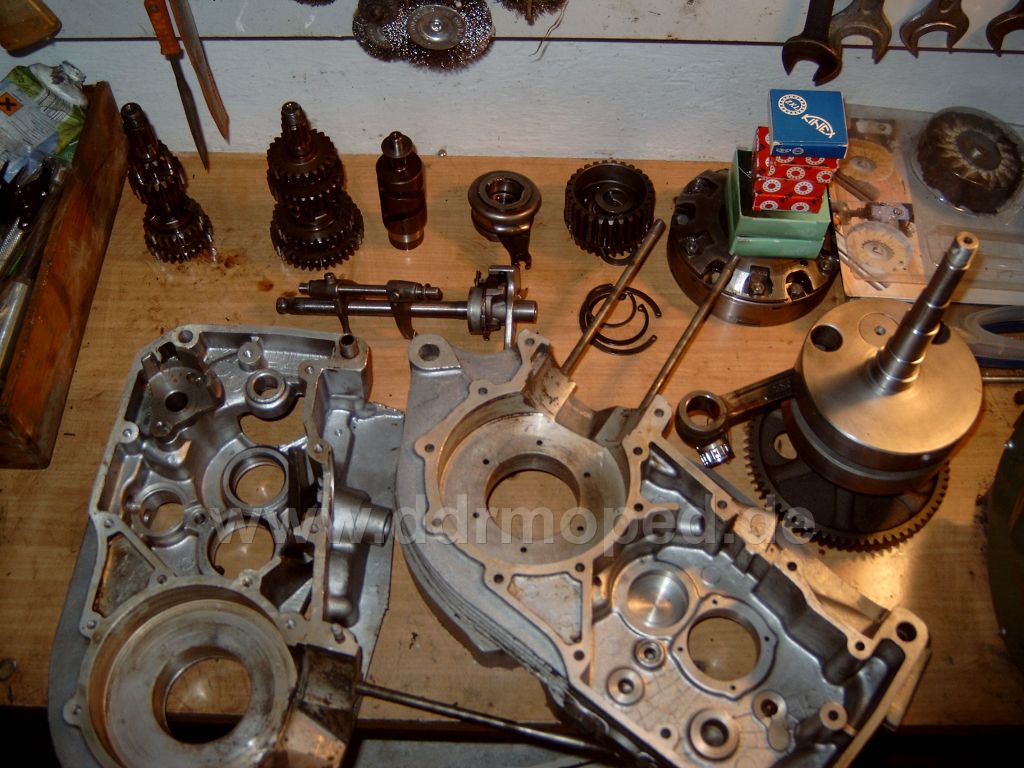 Heute werde ich das Getriebe montieren. Soweit wurde alles bereitgelegt und gesäubert. Sogar das Zylinderproblem ist gelöst - ich bekomme einen originalen DDR- Kolben eingeschliffen :-)
